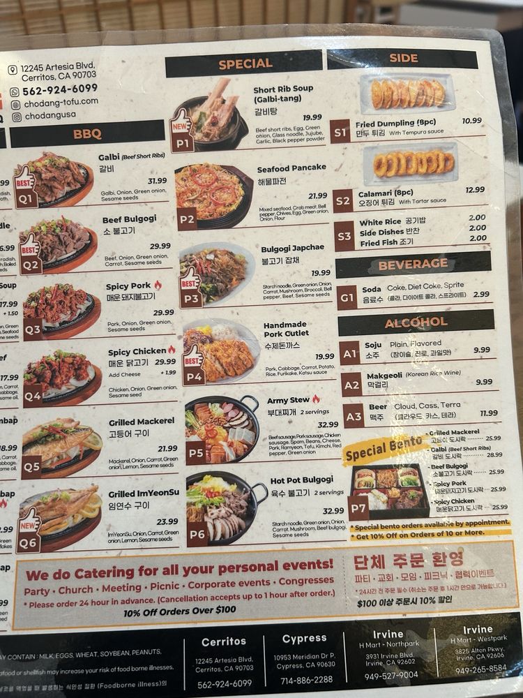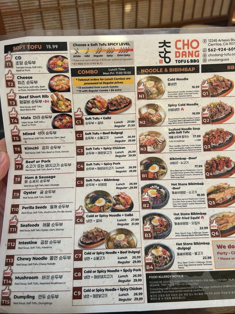ChoDang Tofu & BBQ in Cerritos, CA offers a variety of Korean tofu soup options that are sure to satisfy your cravings. From Soft Tofu with Beef or Pork to Cheese Tofu with Mozzarella cheese, there is something for everyone. The Tofu Combo and Noodle Combo provide a convenient way to try a combination of flavors in one dish. Customers praise the quick service, delicious banchan (side dishes), and welcoming ambiance. The Mala Tofu Soup stands out for its bold and numbing flavors, perfect for those craving a spicy kick. The owner's warm hospitality adds an extra layer of charm to this dining experience. Whether you're a fan of traditional Korean dishes or looking to try something new, ChoDang Tofu & BBQ is a must-visit for flavorful and satisfying meals.